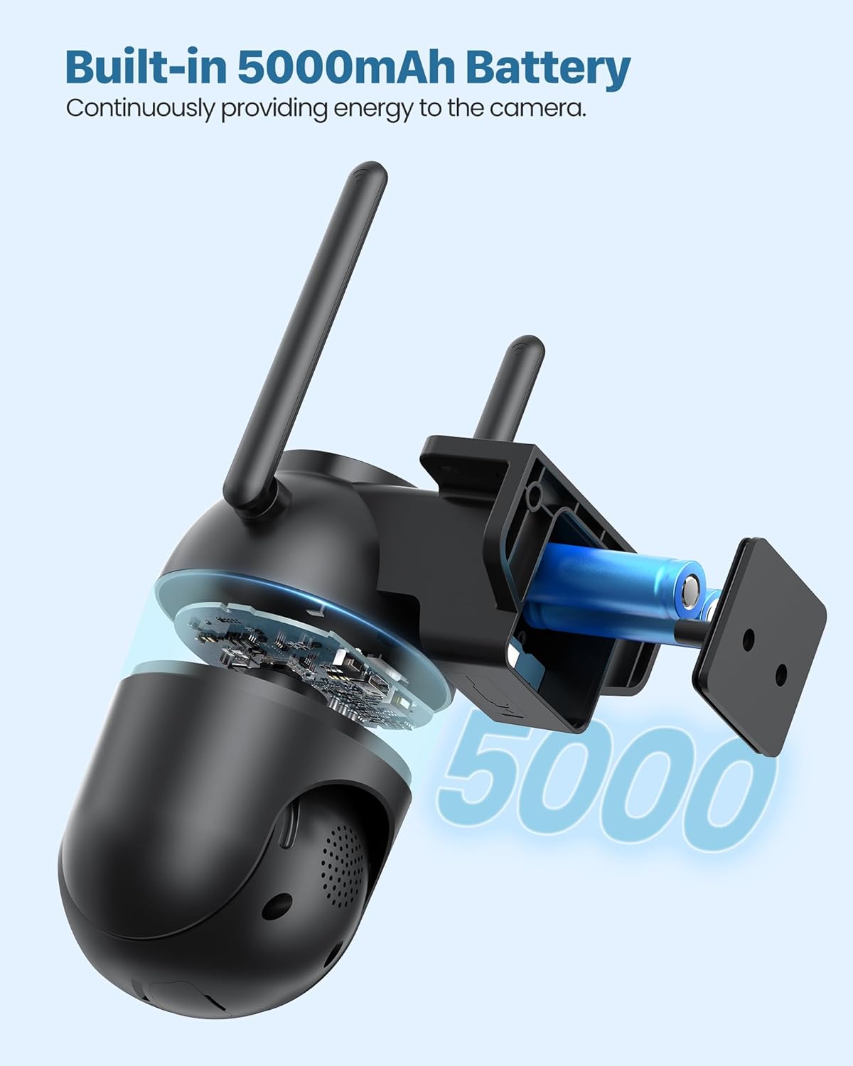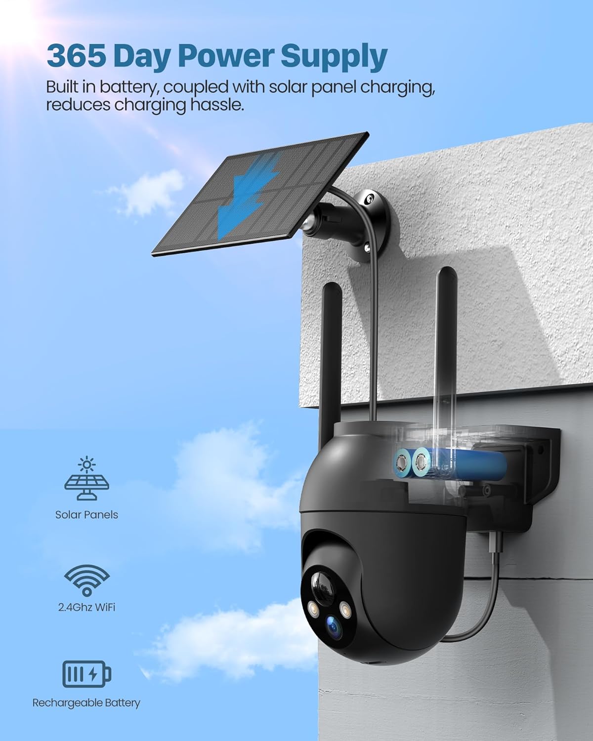 【Eliminate tedious charging steps】The solar camera is equipped with a solar panel and a powerful lithium battery, which allows it to be charged by solar energy during the day and powered by the battery at night, never worrying about low battery. It allows you to completely avoid the hassle of climbing a ladder to remove the outdoor camera for charging.