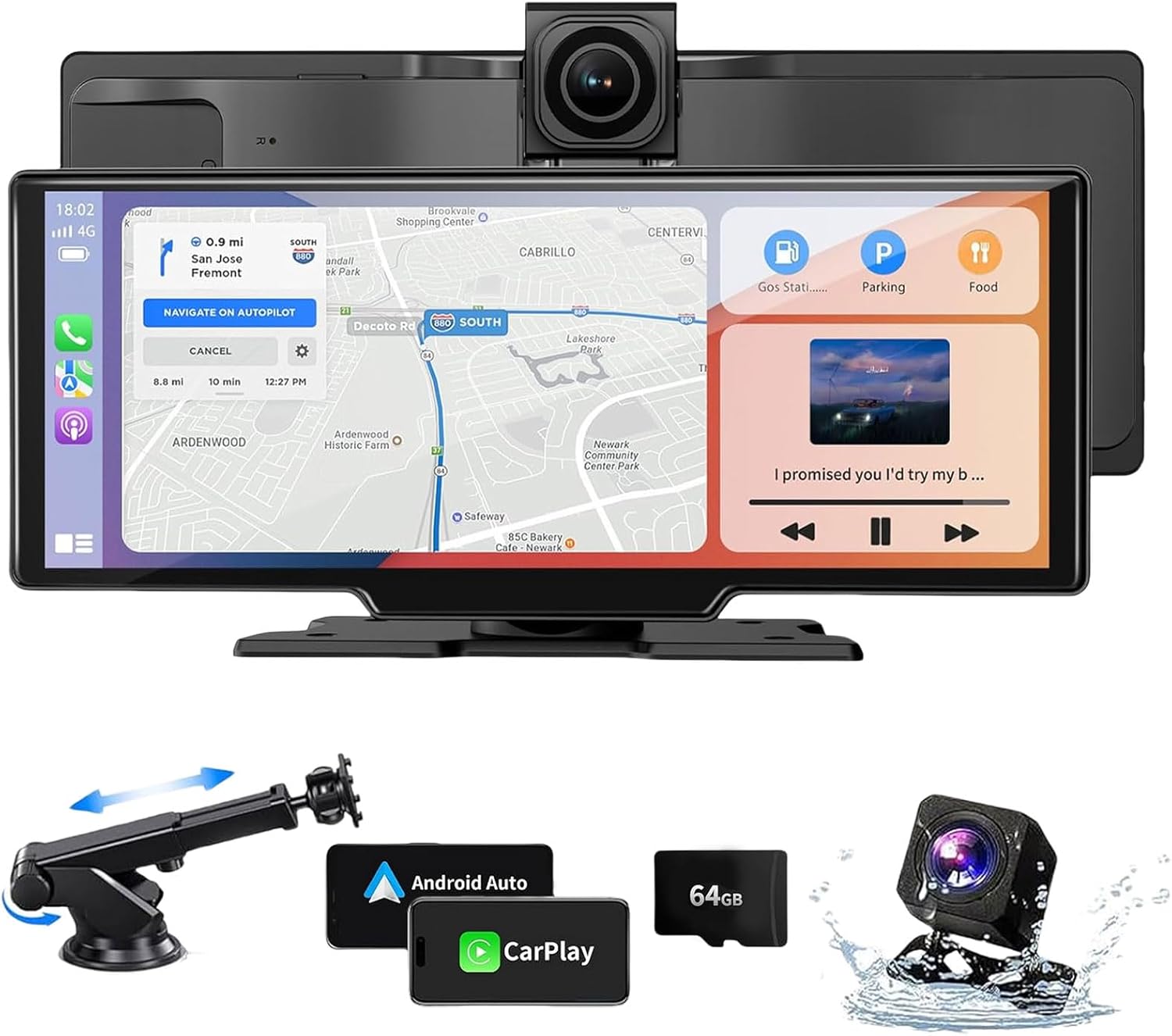 4K and 1080P front backup cameras: equipped with a 4K front camera and a 1080p rear camera, this car table provides wide coverage with 170 ° in the front and 140 ° in the rear. Capture high -definition images, even in bad climatic conditions or at night. With a 64 GB SD card, the Carplay Boques screen automatically and overwhelms previous recordings, except the blocked videos (which are kept during a collision)