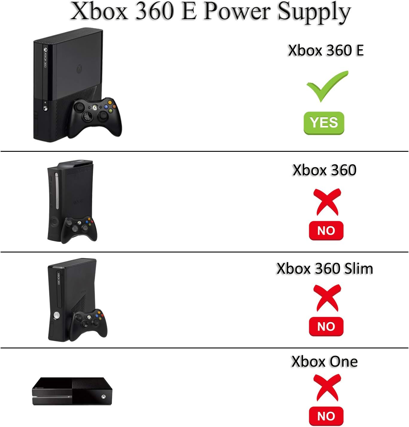 [uowlbear Power Supply for Xbox 360 E] :Perfect fit for XBox 360 E game console, compatible with Xbox 360 E only. Built-in high-performance IC. So that the power supply has over-heat, over-current, over-voltage and short-circuit protection.