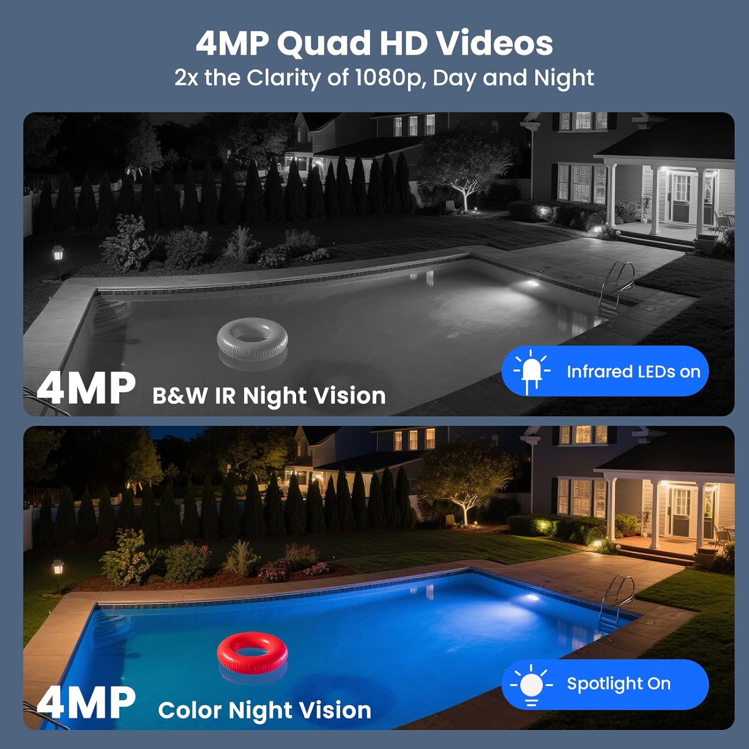 4MP Quad-HD Day & Night videos: The outdoor camera camera has 2 times that many 1080p pixels capture clear and night videos. The 4 professional LEDs IR + Floodlight 2-in-1 help the cameras to see the crystalline black and white night vision even in the darkness of the tone (up to 150 feet), or capture the night vision of color with the flood lights on (App. 20 feet). You can easily change light modes between IR, flood and car lights, from the application of the phone.