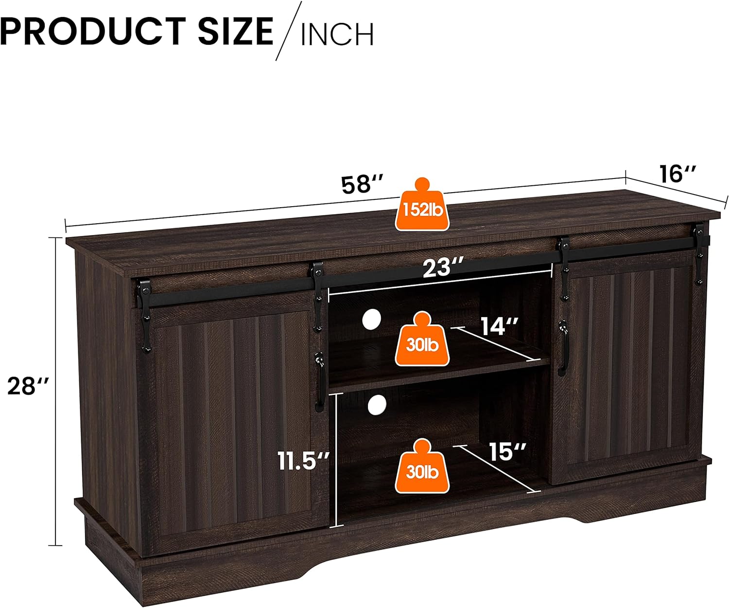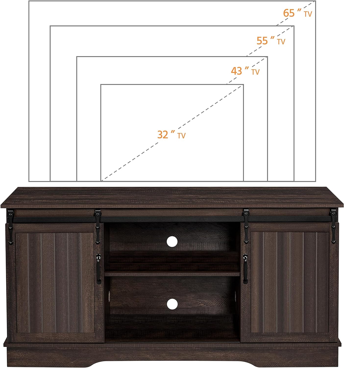 Suitable for TVs up to 65 inches: This media console table with slotted door measures 58 × 16 × 28 inches (length × width × height), so it can accommodate a maximum of 65-inch TV. Please note the applicable size range before purchasing
