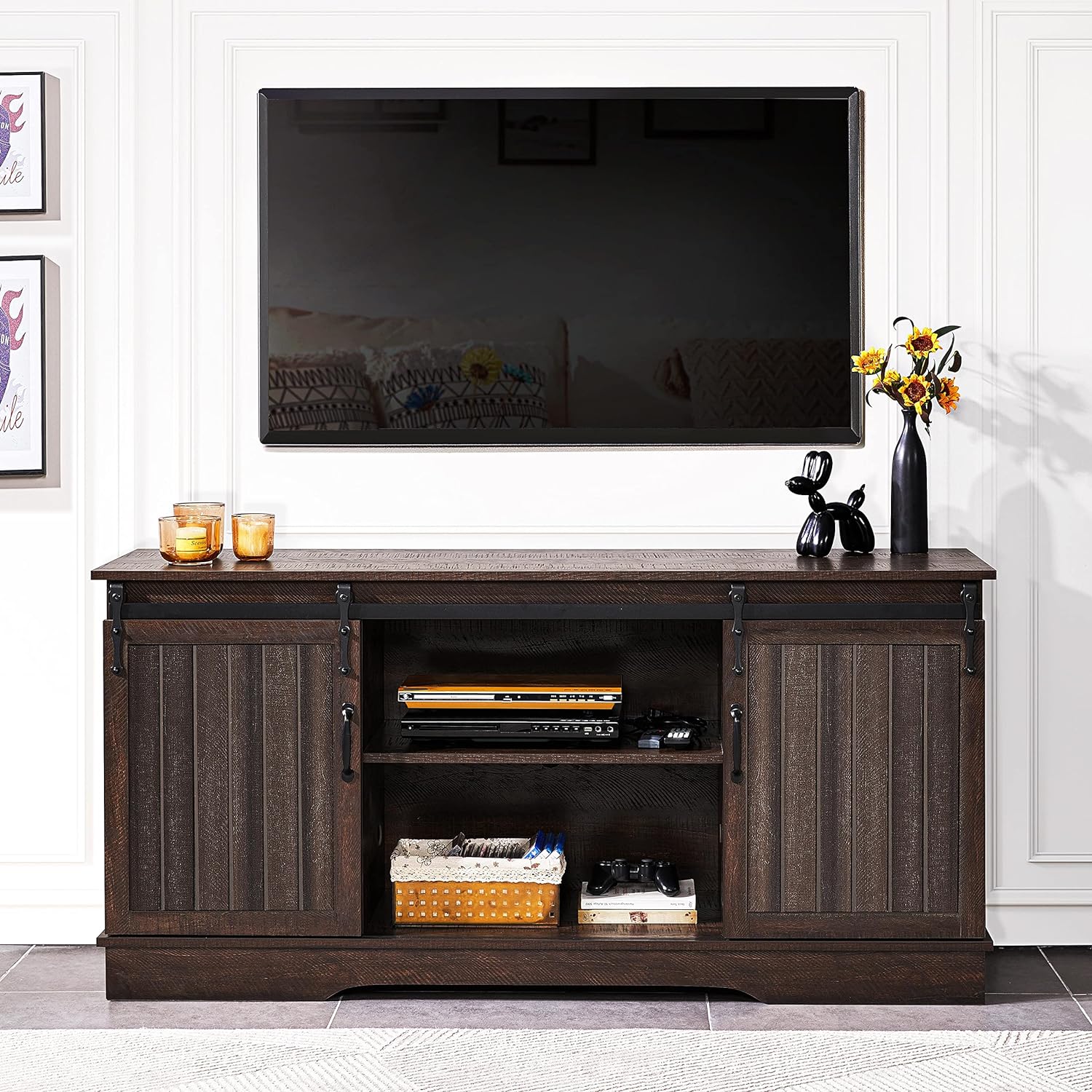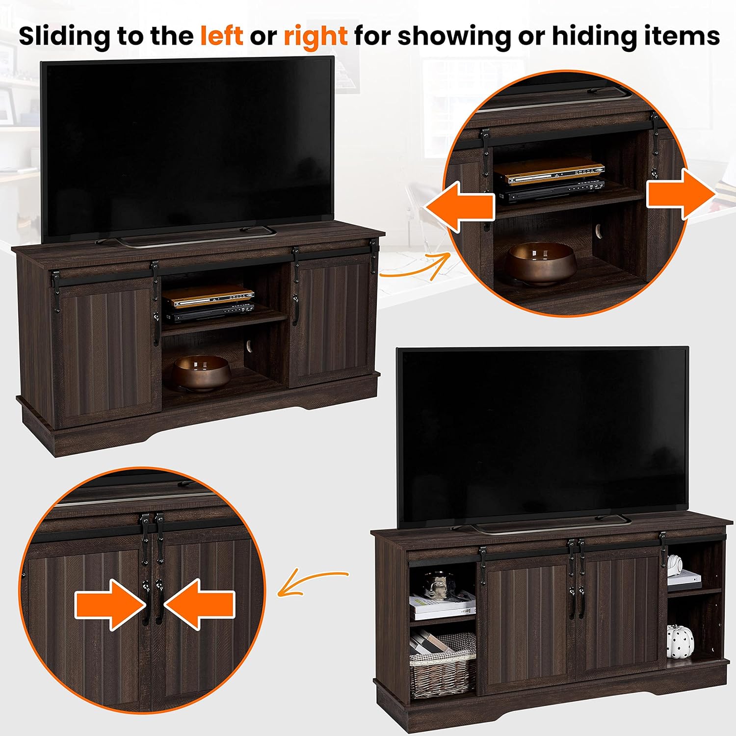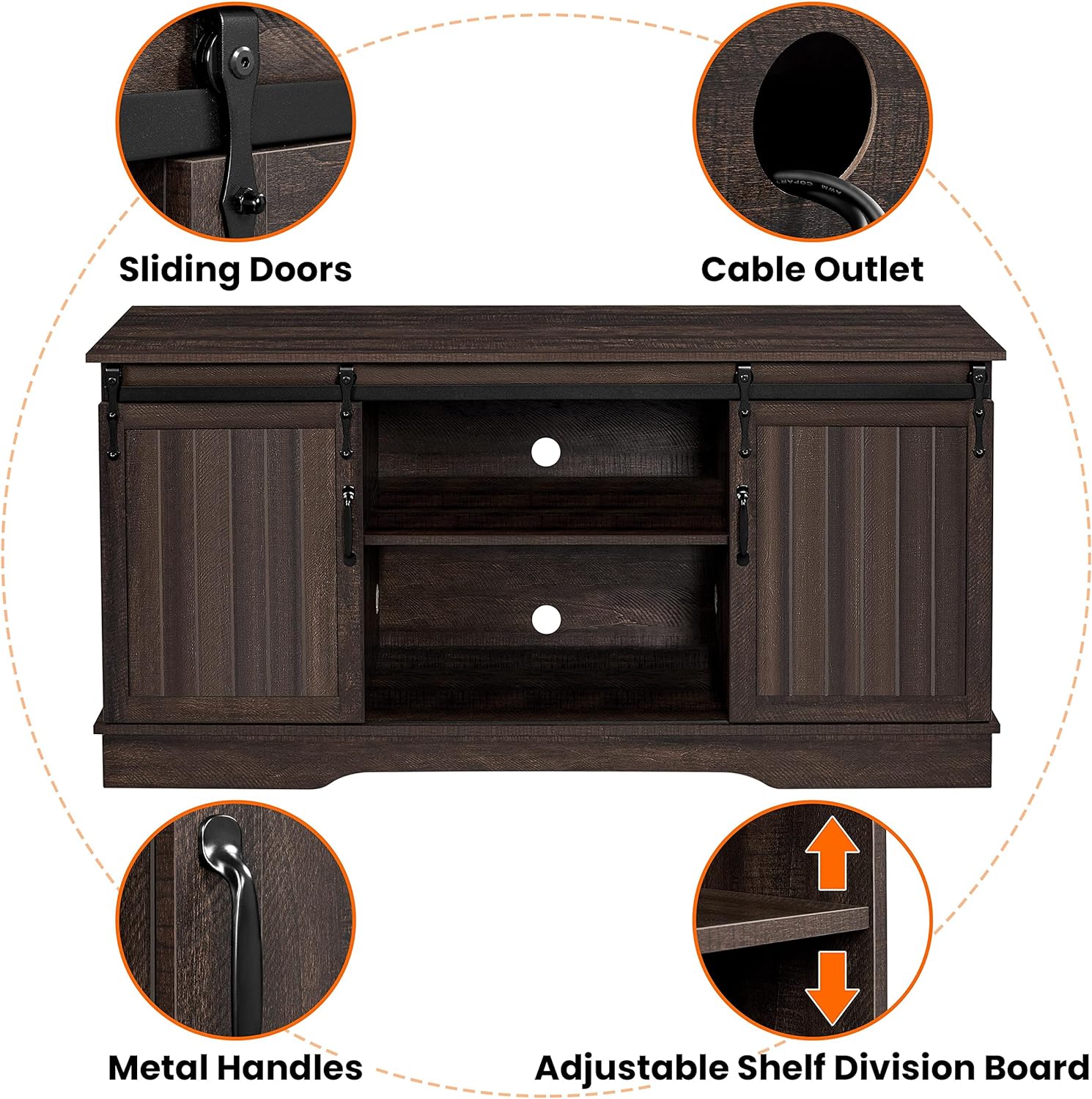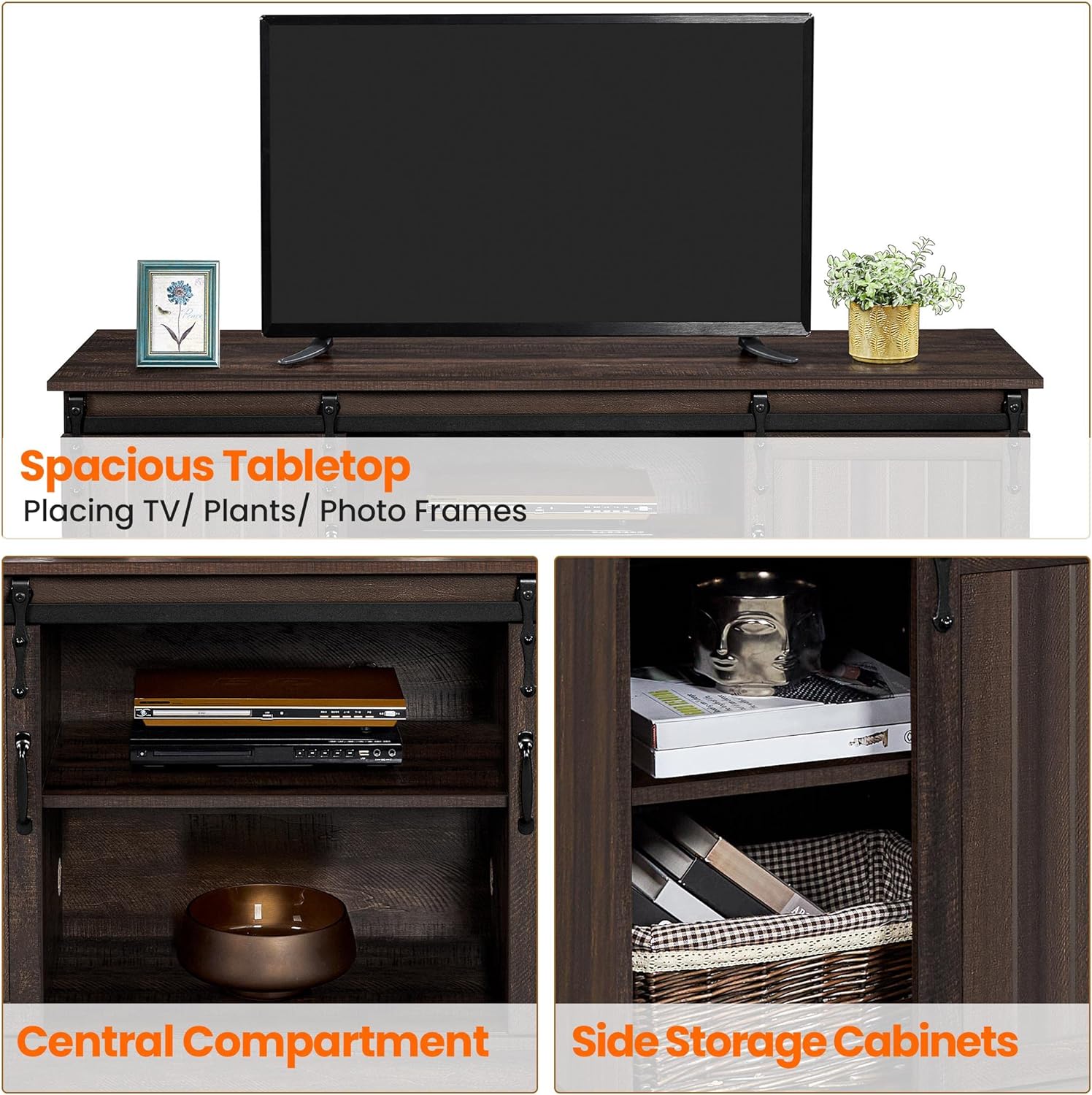 Smooth Sliding Barn Door: Our media console table features a qualified vintage rustic style slotted sliding door, super smooth and comfortable to use, meanwhile, elegant and retro to serve as a tasteful addition to your living room.