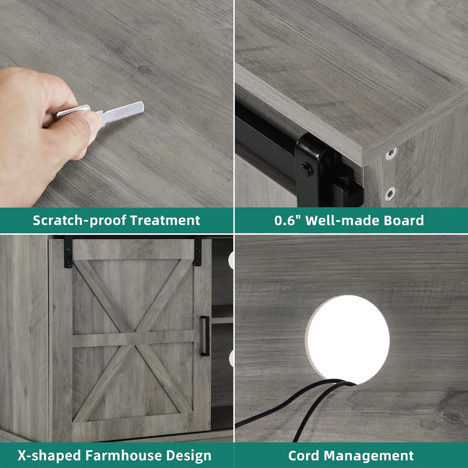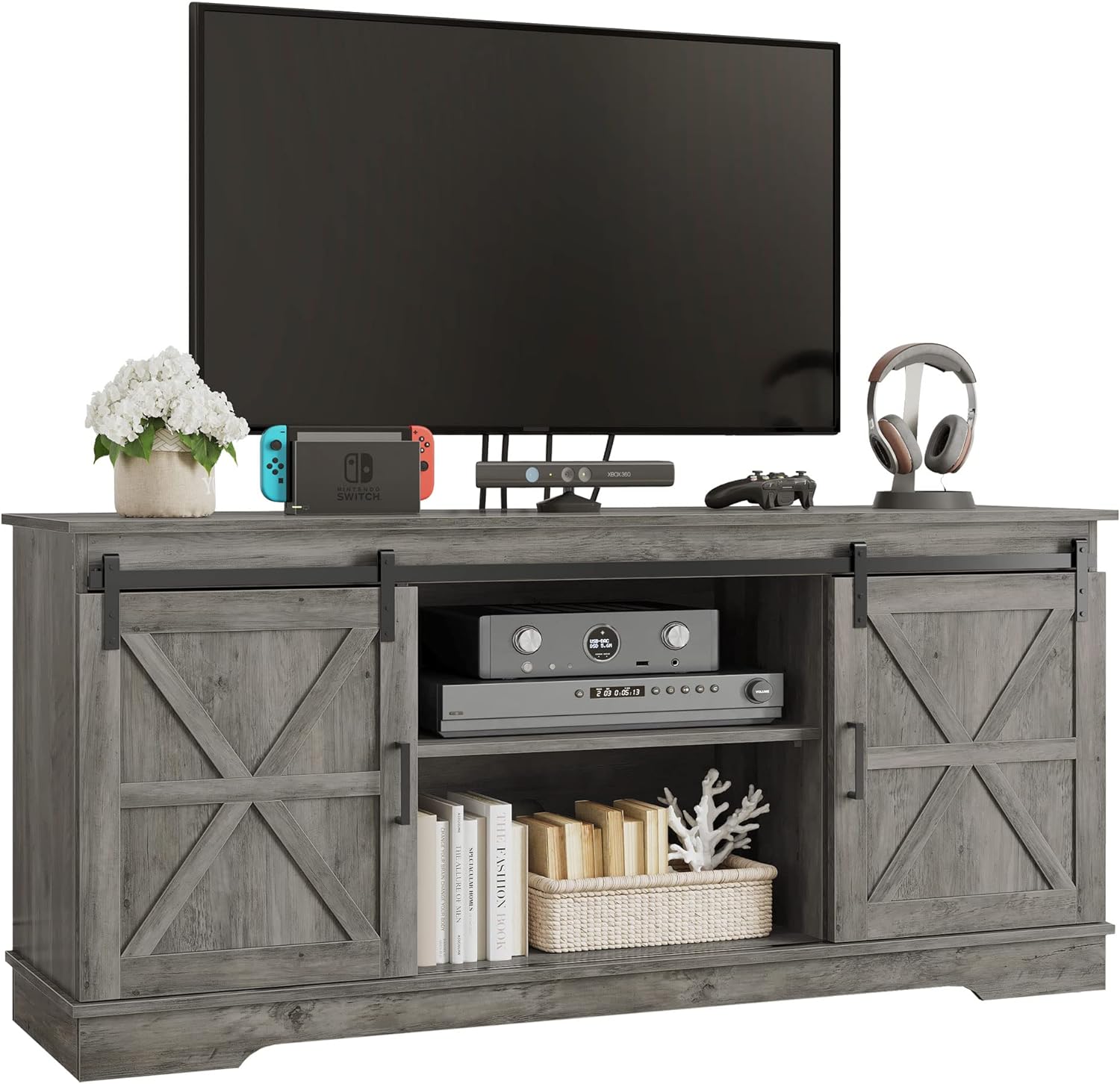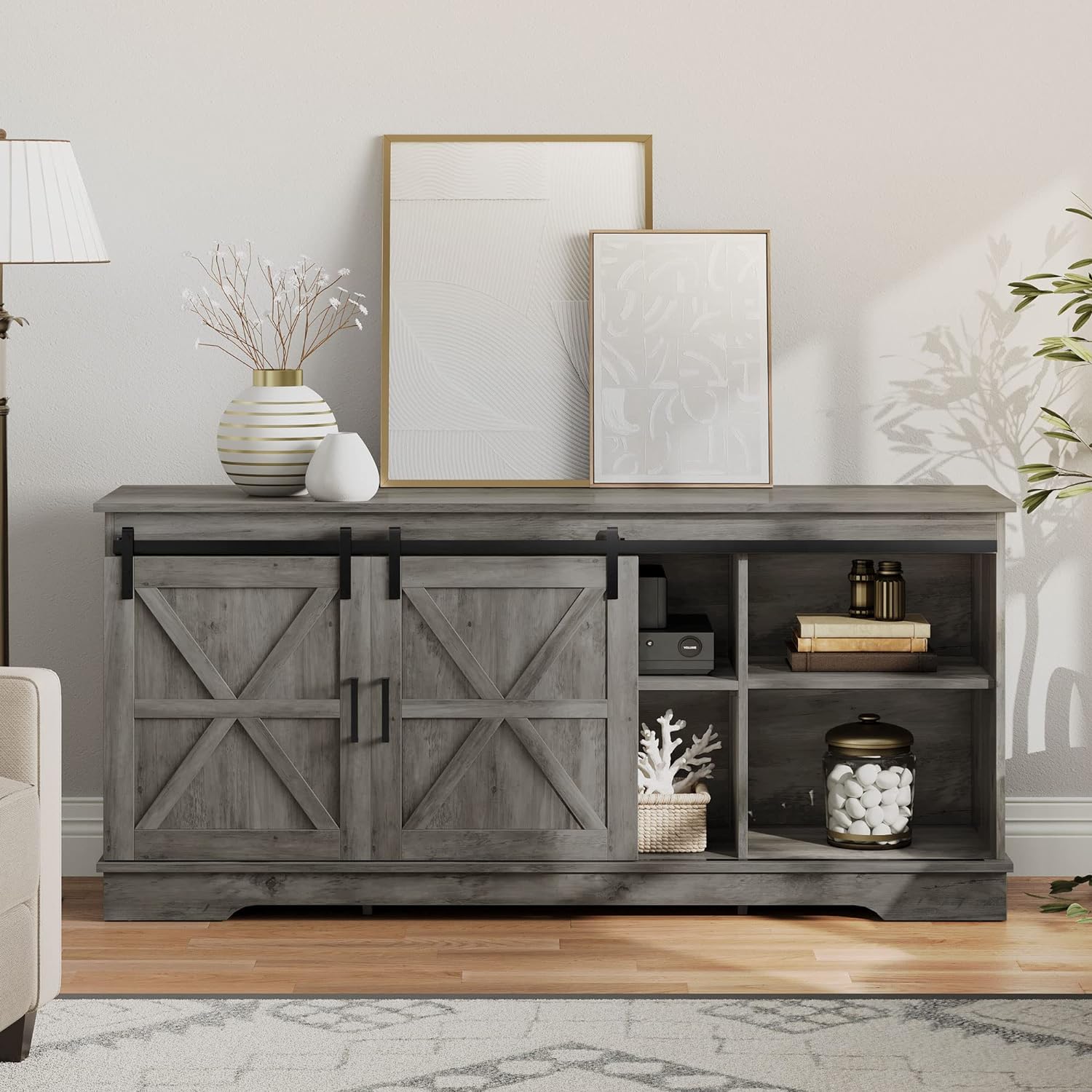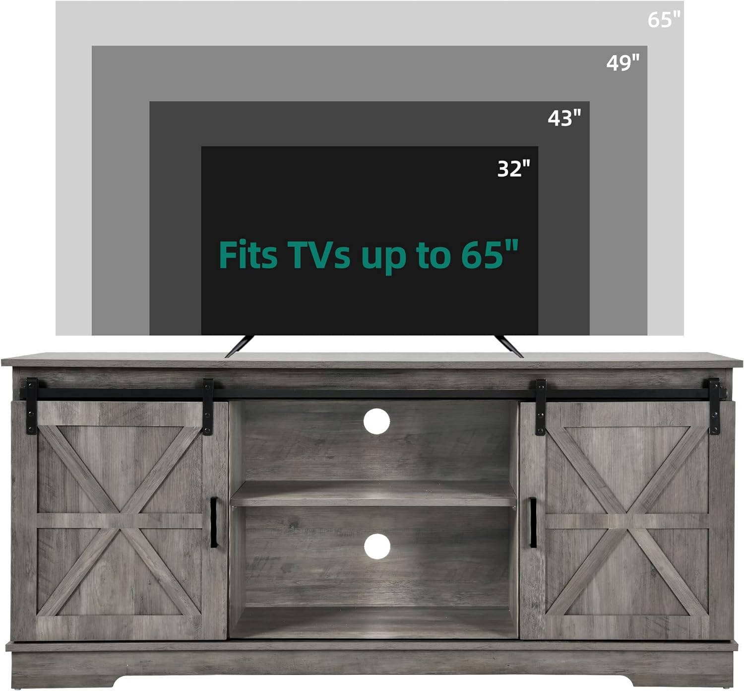 BARN STYLE AND UNIQUE COLOR: Double barn doors with X elements, retro gray color, make the rustic TV stand a decorative and farmhouse furniture piece, easily blending in with other room decor and adding charm natural to your living space. Ideal for rustic, modern or industrial-inspired environments.