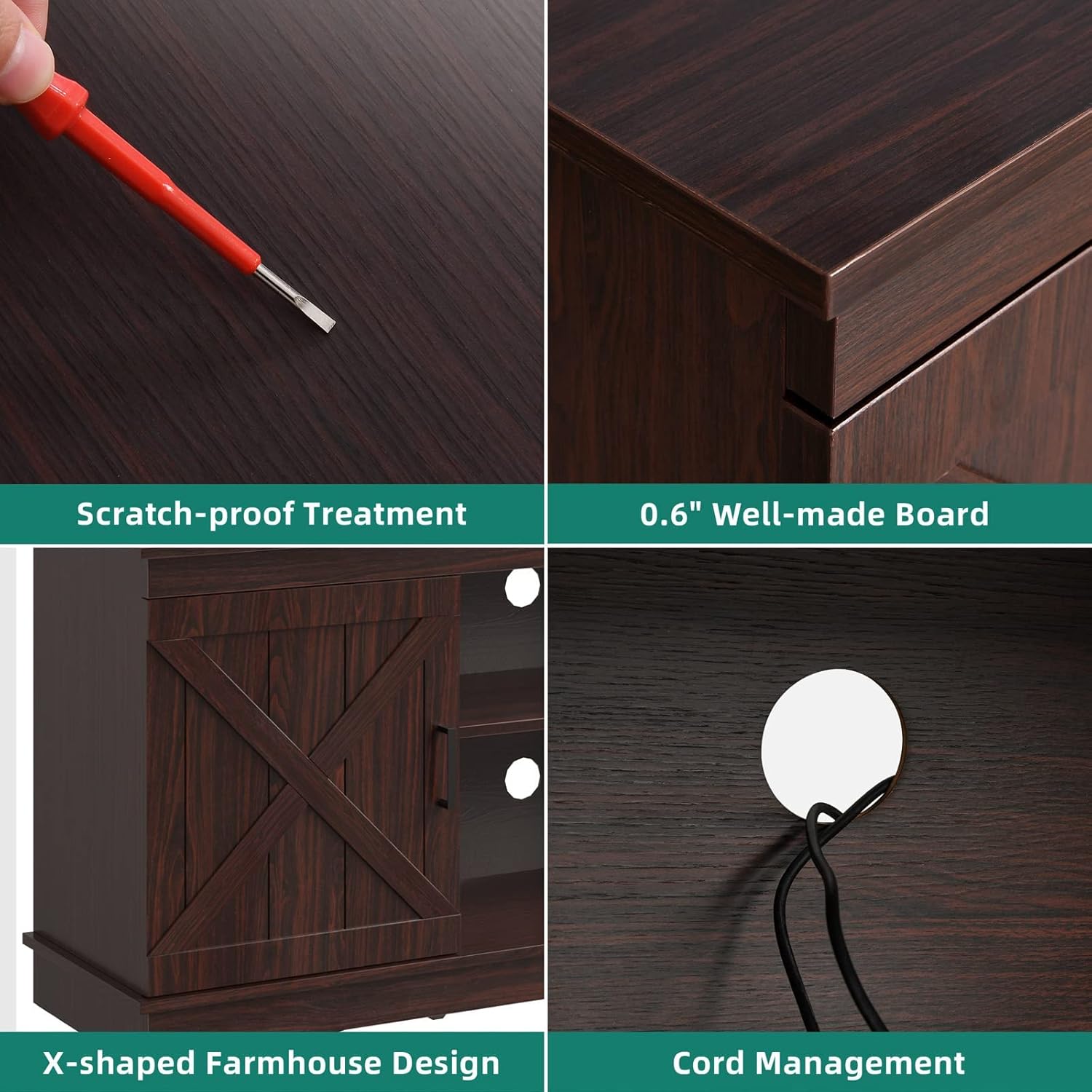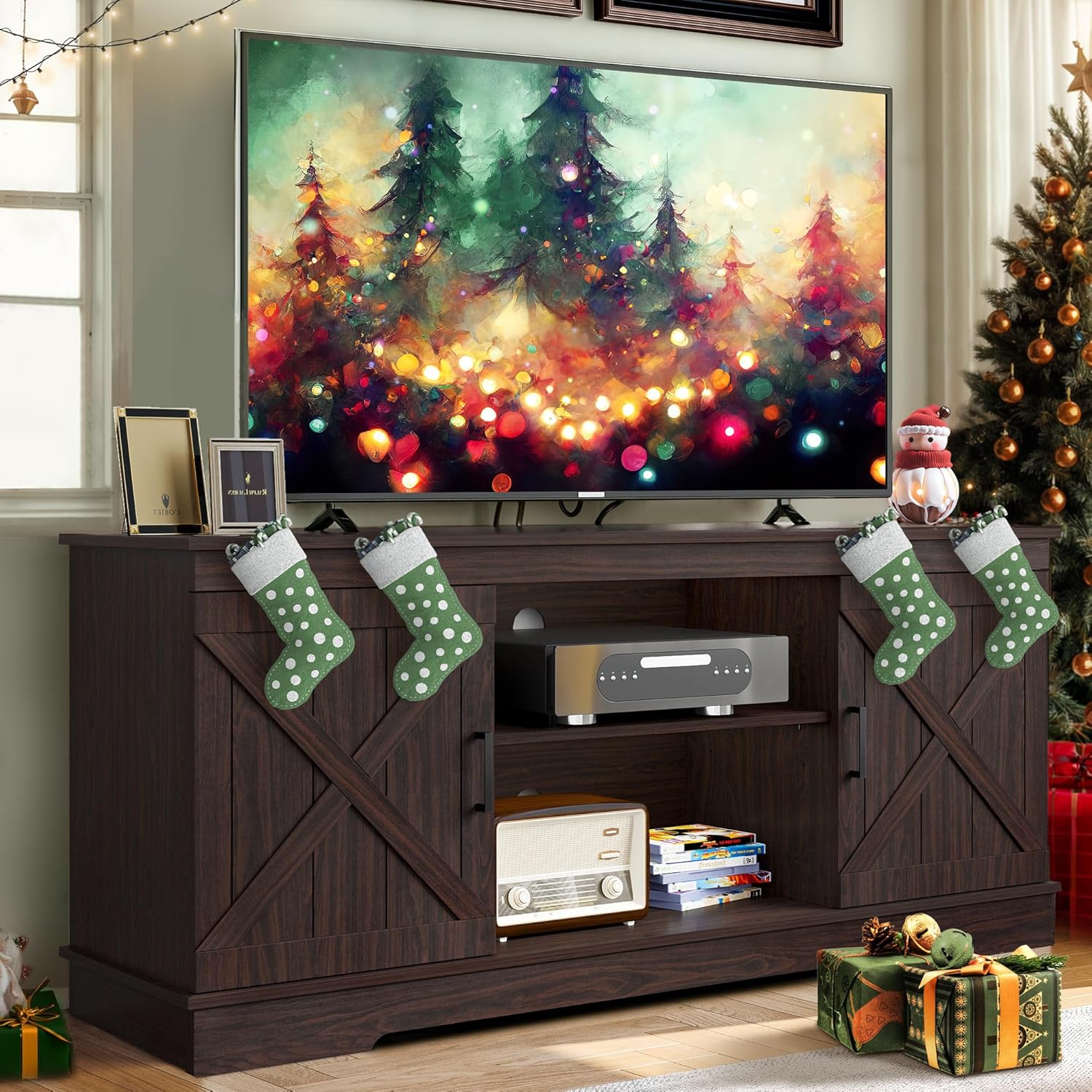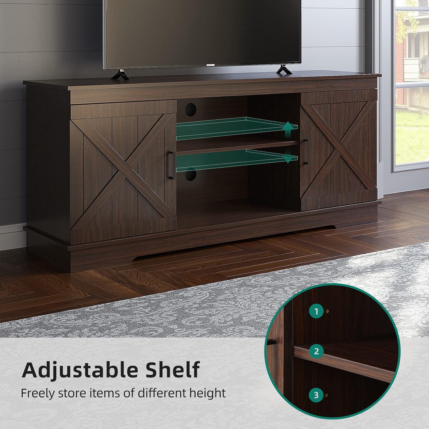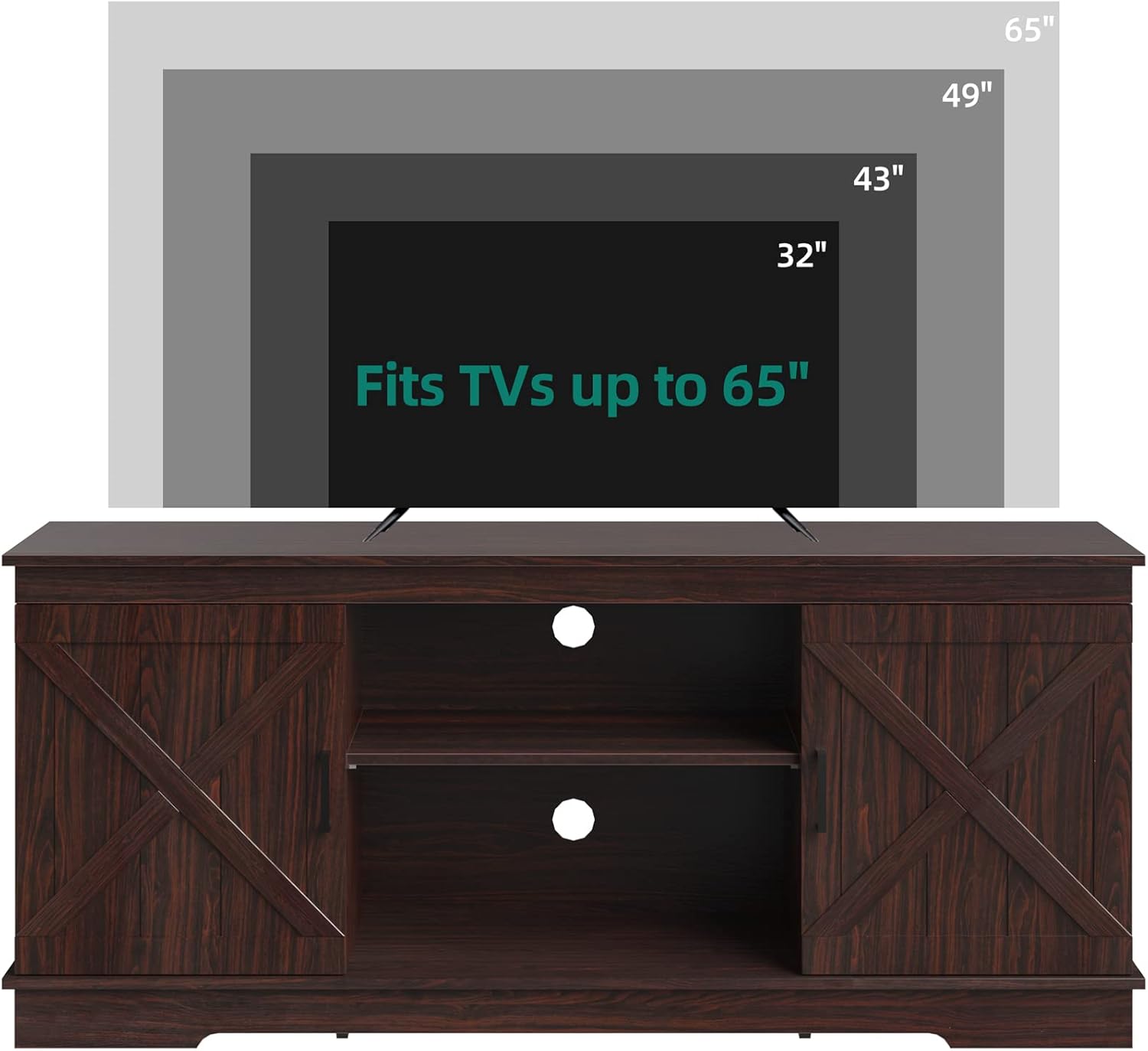 Sturdy and Durable: The farmhouse TV stand is made of well-made wood with unique and exquisite wood grain. This TV stand fits 50/ 55/ 60/ 65 inch TVs. Dimensions: 15.7″D x 59.5″W x 26″H