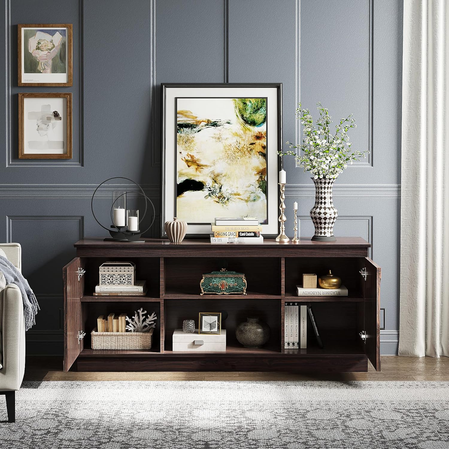 Ample Storage Space: This rustic entertainment center features a spacious tabletop, half open and closed compartments, offering you ample space to display daily items or hide items you don't want to see. Not only can it be used as a TV stand, but also can be used as a sideboard, storage cabinet, display cabinet, pantry, wine bar cabinet, etc.