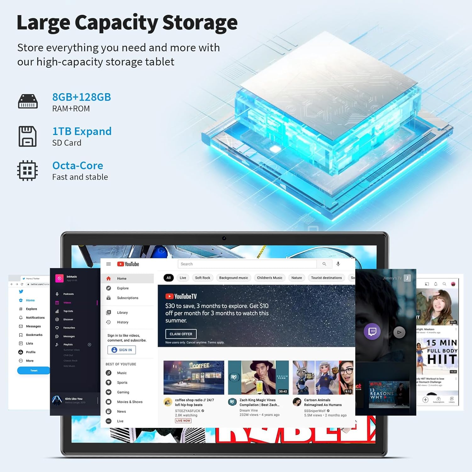【8GB RAM + 128GB ROM + 1TB Expansion】The 10 inch Android tablet is equipped with 8GB RAM for smooth multitasking and efficient performance. It also has 128GB ROM storage to store your apps, files and media. Micro SD card slot provides up to 1TB of expandable memory, giving you unlimited options (card not included)