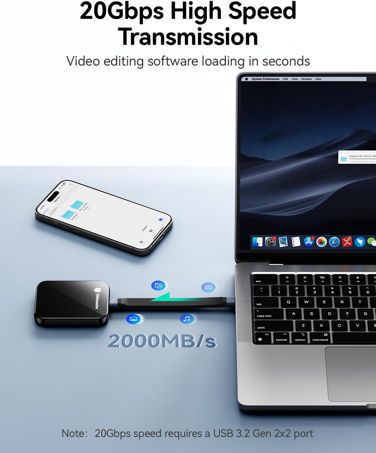 【2000MB/s High Speed Transfer】Yottamaster portable SSD offers a maximum transfer speed of up to 20Gbps, allowing you to transfer a 2GB file in just 1 second. This significantly reduces file transfer time and increases work efficiency. Note: To achieve 20 Gbps transfer speeds, a USB 3.2 Gen2x2 interface and a 20 Gbps data cable are required.