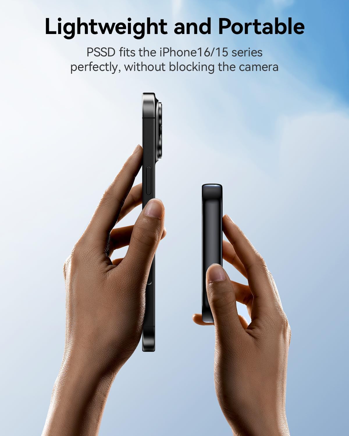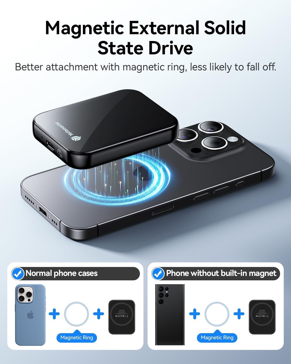 【Magnetic Design】The 1TB magnetic pssd can connect directly to iPhones and phone cases with MagSafe support, and also includes a magnetic ring to connect to devices and cases without built-in magnets. This makes it the ideal choice for mobile photography enthusiasts, allowing them to store a large number of high-resolution photos and videos anytime, anywhere, perfectly combining portability and efficiency.