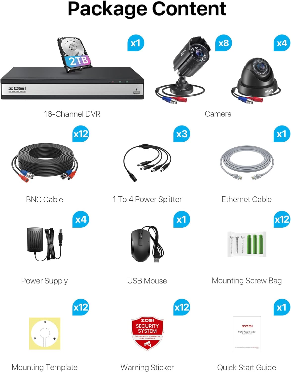 ZOSI Security Camera System Add to Cart Add to Cart Add to Cart Add to Cart Add to Cart Add to Cart Add to Cart Customer Reviews 4.1 out of 5 stars 351 4.2 out of 5 stars 1,516 4.3 out of 5 stars 1,884 4.2 out of 5 stars 1,233 4.3 out of 5 stars 1,555 4.3 out of 5 stars 1,884 4.2 out of 5 stars 59 Price $331.49$331.49 $78.99$78.99 $419.99$419.99 $579.99$579.99 $21.99$21.99 789.99 $1,199.99 1,199.99 Resolution 1080P 6MP (3MP+3MP) 4K 4K 1080P 4K 4K DVR/NVR Security DVR 16 Channels / 8 Channel PoE NVR 8 Channel PoE NVR / 24 Channel PoE NVR 24 Channel PoE NVR Camera Security Camera*12 Dual Lens WiFi Camera*1 4K PoE Cameras*8 4K PoE Cameras*8 Bullet Cameras* 1 4K PoE cameras*8 4K PoE cameras*16 Connection type BNC cable 2.4/5Ghz WiFi Power over Ethernet Power over Ethernet BNC cable Power over Ethernet Power over Ethernet Pre-installed hard drive 2TB Security Hard Drive / 2TB Security Hard Drive 2TB Security Hard Drive / 4TB Security Hard Drive 4TB Security Hard Drive Night Vision 80ft 33ft 100ft 100ft 80ft 100ft 100 feet