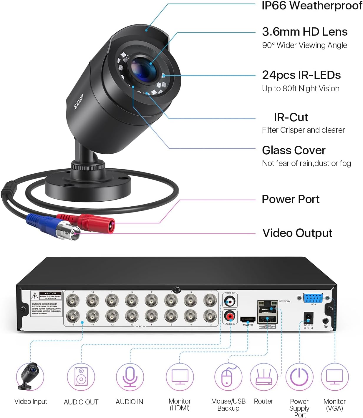 【16PCS Weatherproof Bullet Camera, 80ft Night Vision】These cameras use aluminum metal, can be installed in outdoor or indoor locations. Night vision up to 80 feet in total darkness and 130 feet night vision in ambient light.