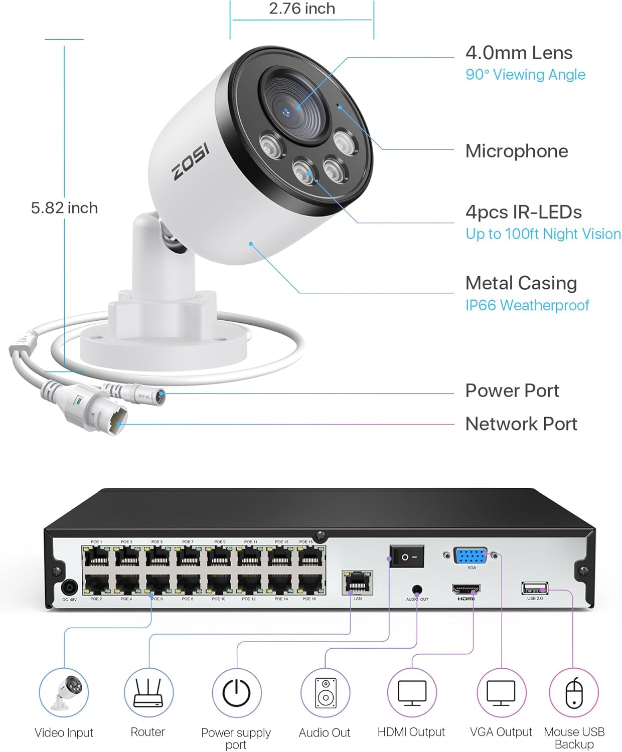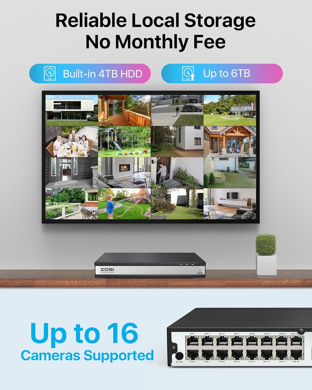 【16CH 4K PoE NVR System】With advanced H. 265 technology, which could double the data compression ratio, keep high quality video even at low bit rate. This is a 16 channel 4K NVR recorder, you can add more ZOSI 4K, 5MP, 4MP and 3MP PoE cameras. (Only supports ZOSI PoE camera). And the PoE camera connects to the NVR through a cable that transmits data and power, which is easy to install and low cost.