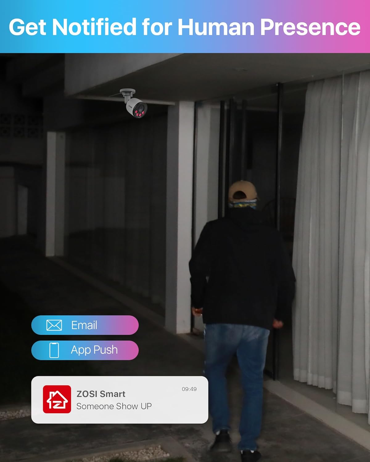 【Smart Human Detection & Instant Alerts】Customize specific motion detection zones on each camera to minimize false alarms. Receive instant smart notifications and email alerts when human motion is detected.