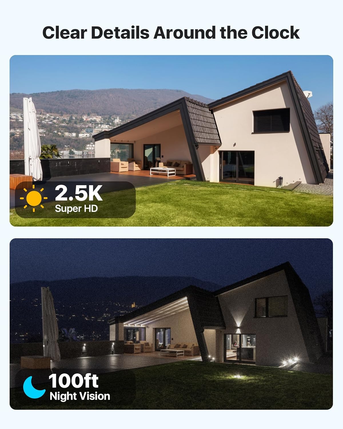 【4MP UHD & 100ft Night Vision】The camera can get real-time 4MP Ultra HD video at 25fps, record clear details and capture more action without missing a beat. Enhanced night vision up to 100 feet. No matter the day or night, you will be able to clearly see what is happening in your home or business.