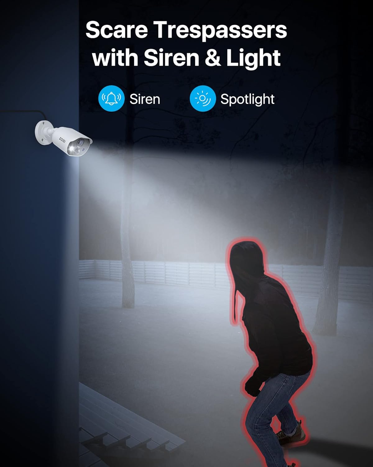 【Smart Sound & Light Alarm】This camera will react to any potential danger with a smart sound and light alarm to prevent trouble when triggered by human motion events or controlled manually. Built-in bright white lights and high-pitched siren provide double security and keep you protected even when you are asleep.